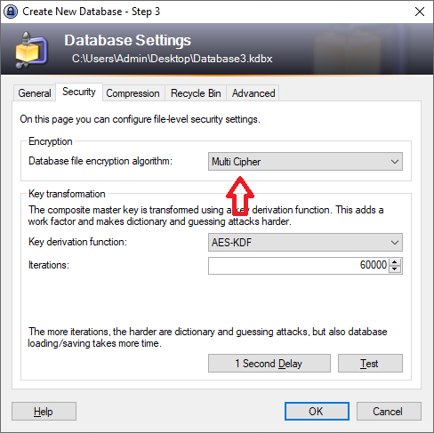 Run KeePass and create or open an existing KeePass database, change the database file encryption algorithm to "Multi Cipher" as shown below, other setting may be changed as per preference.