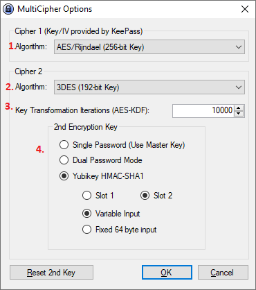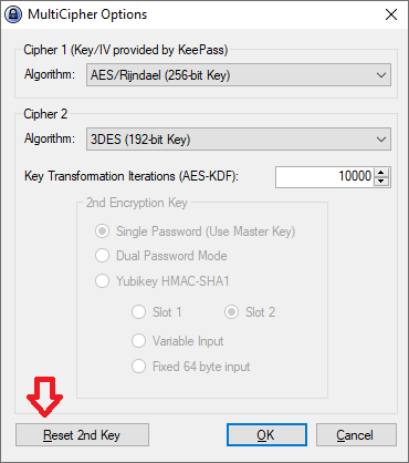 To change the 2nd Key click the "Reset 2nd Key" button. If you choose the Dual Password mode you will be ask to provide a new password for your 2nd Key. If you choose Yubikey HMAC-SHA1 make sure the options chosen matches with the configured Yubikey as described below
