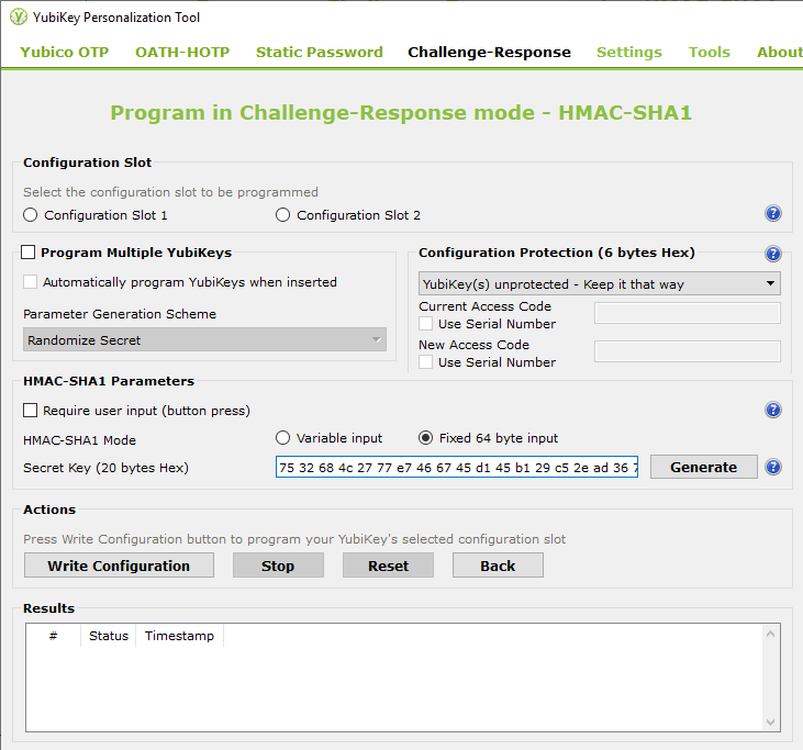 Finally, click on the Write Configuration to save the settings on Yubikey (More about Yubikey Challenge/Response)